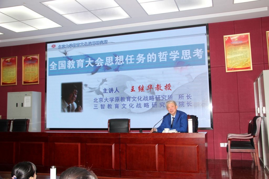 报告厅座无虚席,来自北京大学原教育文化战略研究所所长、三智教育文化战略研究院院长王继华教授给我校全体教师解读全国教育大会精神,我校党总支第一书记、校长朱家芳主持。