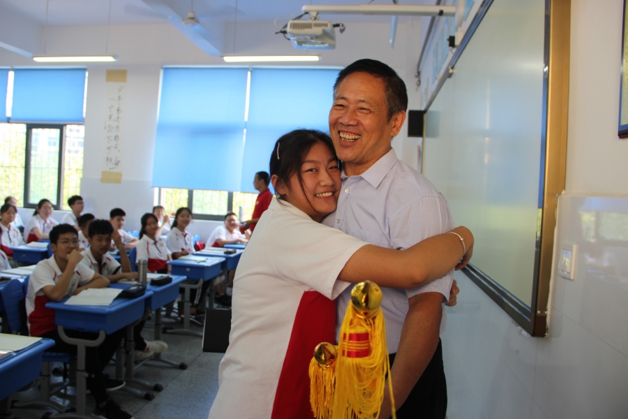 9月9日上午,集团北校九(7)班教室,今年刚刚退休的王圣祥老师给学生上完最后一堂课,一位学生跑上讲台紧紧拥抱王老师。