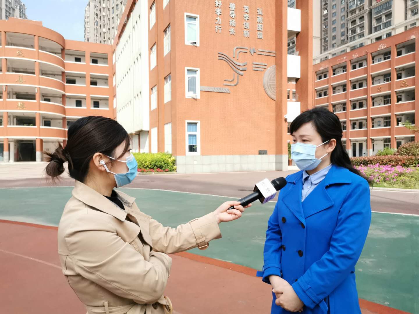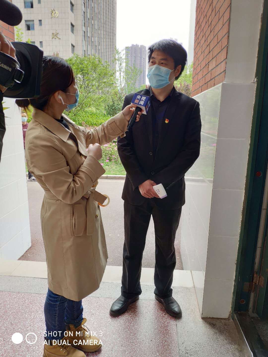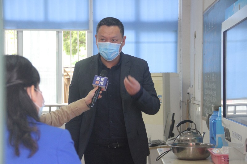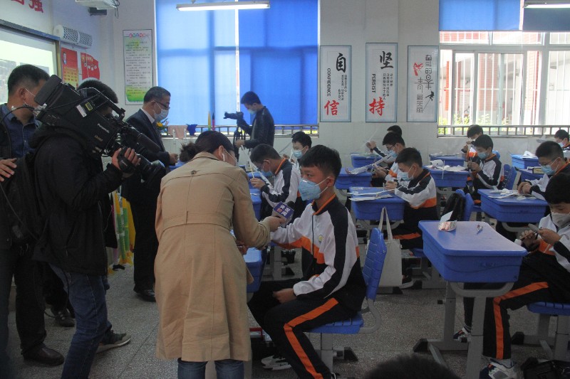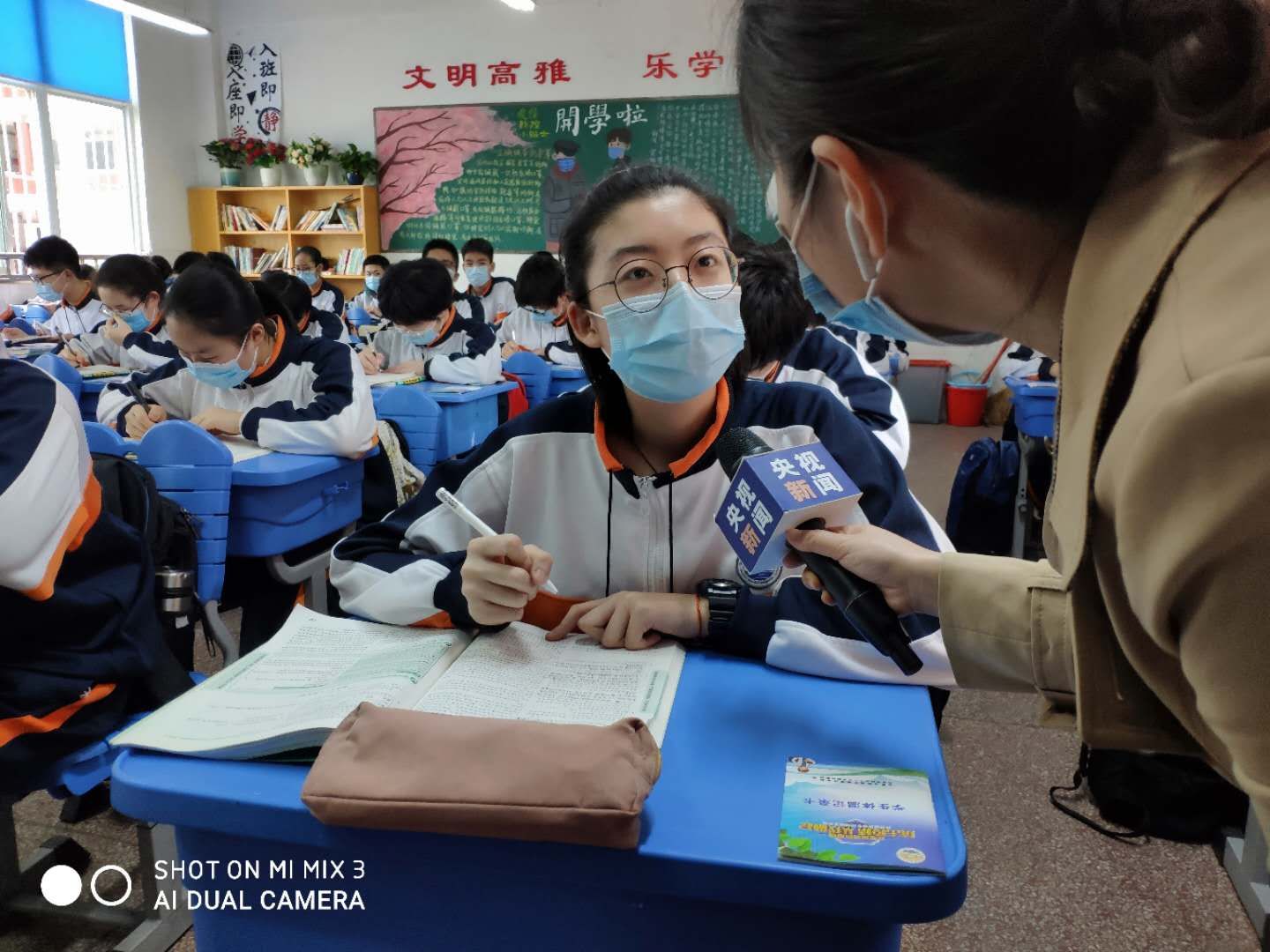 午间13点开始央视新闻客户端又进行了新媒体网络直播。记者跟随着校长陈立利,从一楼八(22)开始详细的介绍学生中午午餐看护情况、师生电子健康信息台账的建立、午间社团活动的开展。期间恰逢九年级学生下午返校上课,央视记者饶有兴趣的走进九年级教室。陈立利在九年级一教室的防疫角,介绍我校防疫情况。集团前期实施了全方位无死角的校园消毒,给每班配备的防疫物品情况,为每位学生制作了体温记录卡,设置了错峰上学放学机制。记者也随机采访了正在给学生测量体温的班主任老师和正在教室自习的九年级学生。