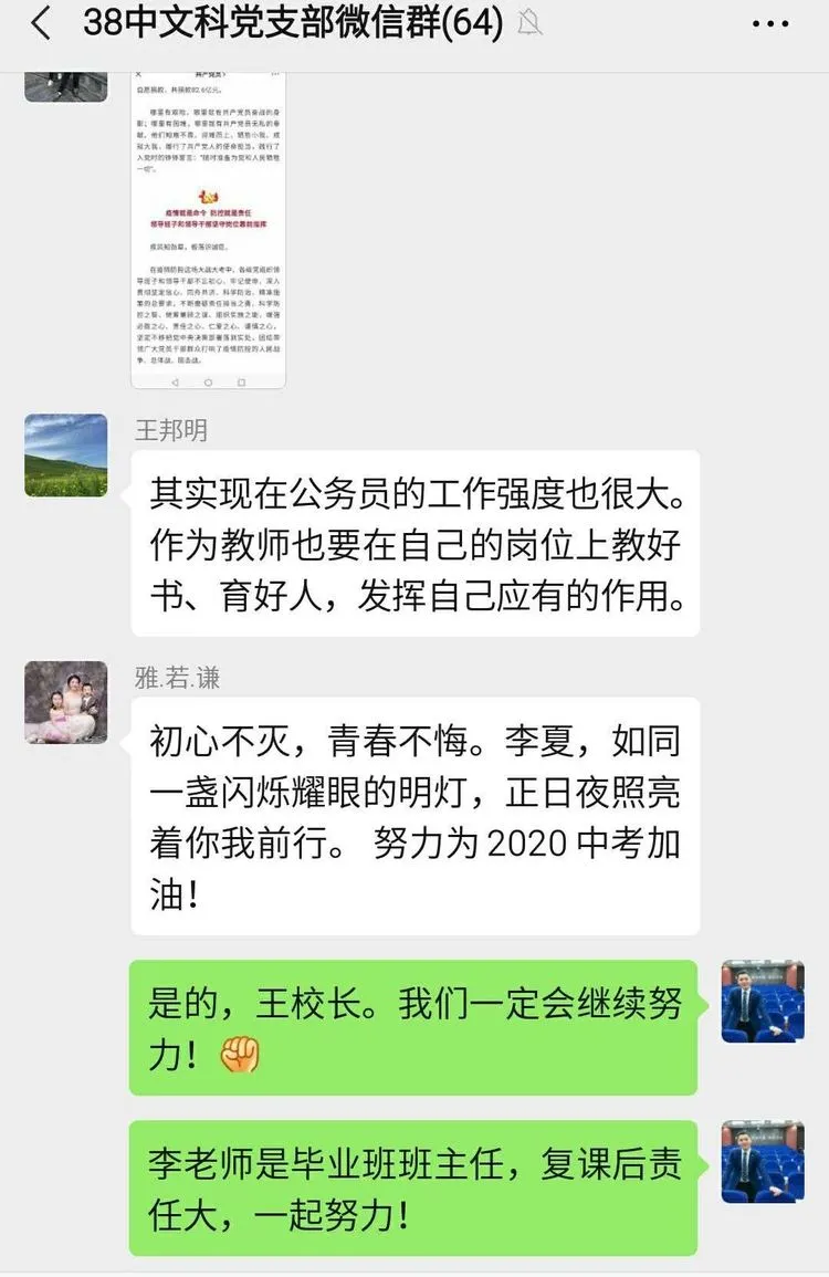 2020年4月10日上午9时,合肥市第三十八中学文科党支部开展“学先进事迹,争做学生健康保驾护航人”主题党日活动。活动内容如下:一、利用学习强国平台,开展专题学习——典型事迹片《生如夏花》;二、学习《党建研究》文章:关键时刻冲得上去,危难关头豁得出来;三、学习《合肥市第三十八中学教育集团新冠肺炎疫情防控暨学生开学进校园演练》相关内容。